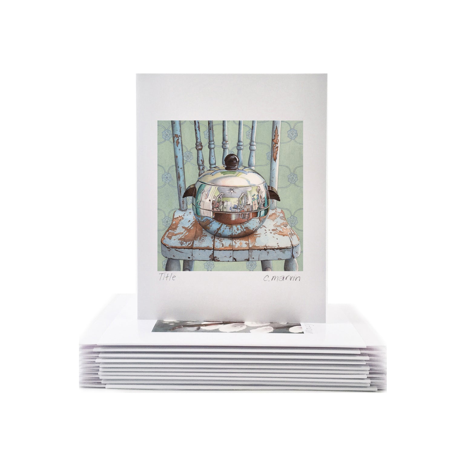 Each art card measures 4X5", comes with a matching white envelope (5.75X4.5") and is titled and signed within a clear plastic sleeve. The print is beautifully crisp and fade-resistant.