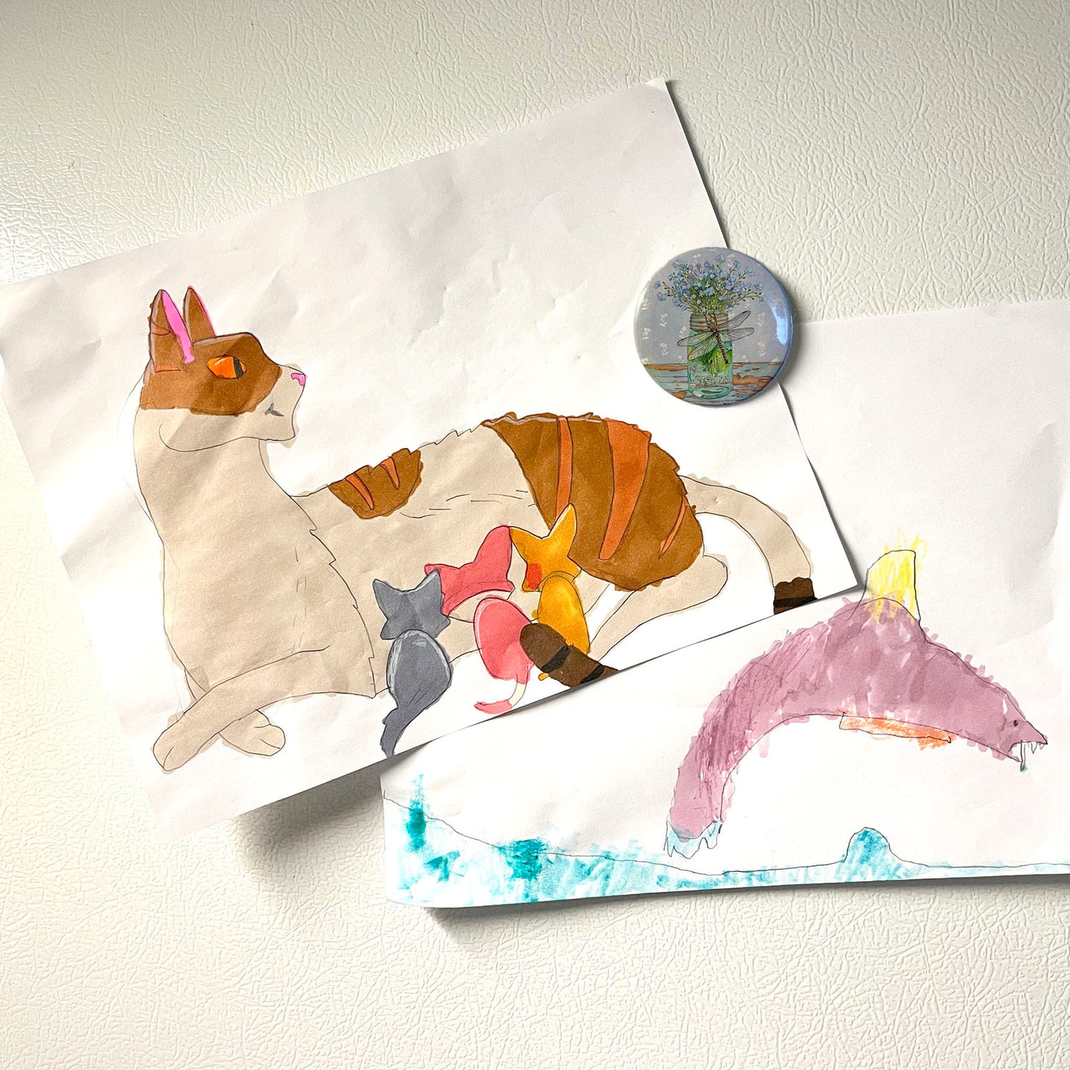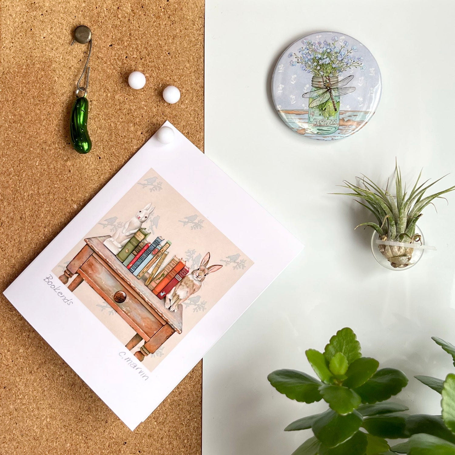 Each magnet measures 2.25” round and is totally protected from the messy kitchen environment with a laminated surface. Beautifully packaged with a removable backing, these are great tucked in an art card or just gifted on their own. The magnet is very strong and capable of holding many papers and photos on your fridge, whiteboard, filing cabinet or locker.