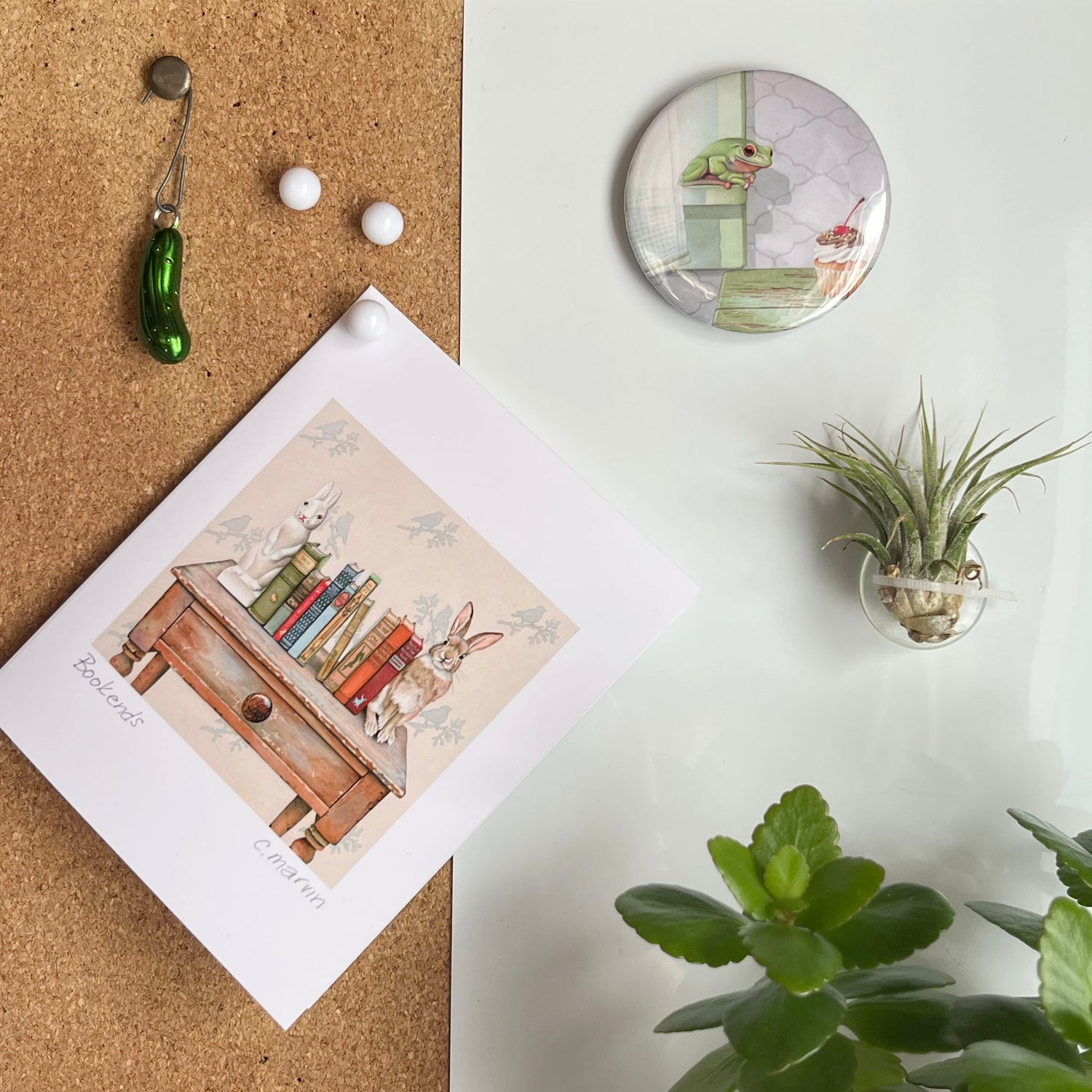 Each magnet measures 2.25” round and is totally protected from the messy kitchen environment with a laminated surface. Beautifully packaged with a removable backing, these are great tucked in an art card or just gifted on their own. The magnet is very strong and capable of holding many papers and photos on your fridge, whiteboard, filing cabinet or locker.