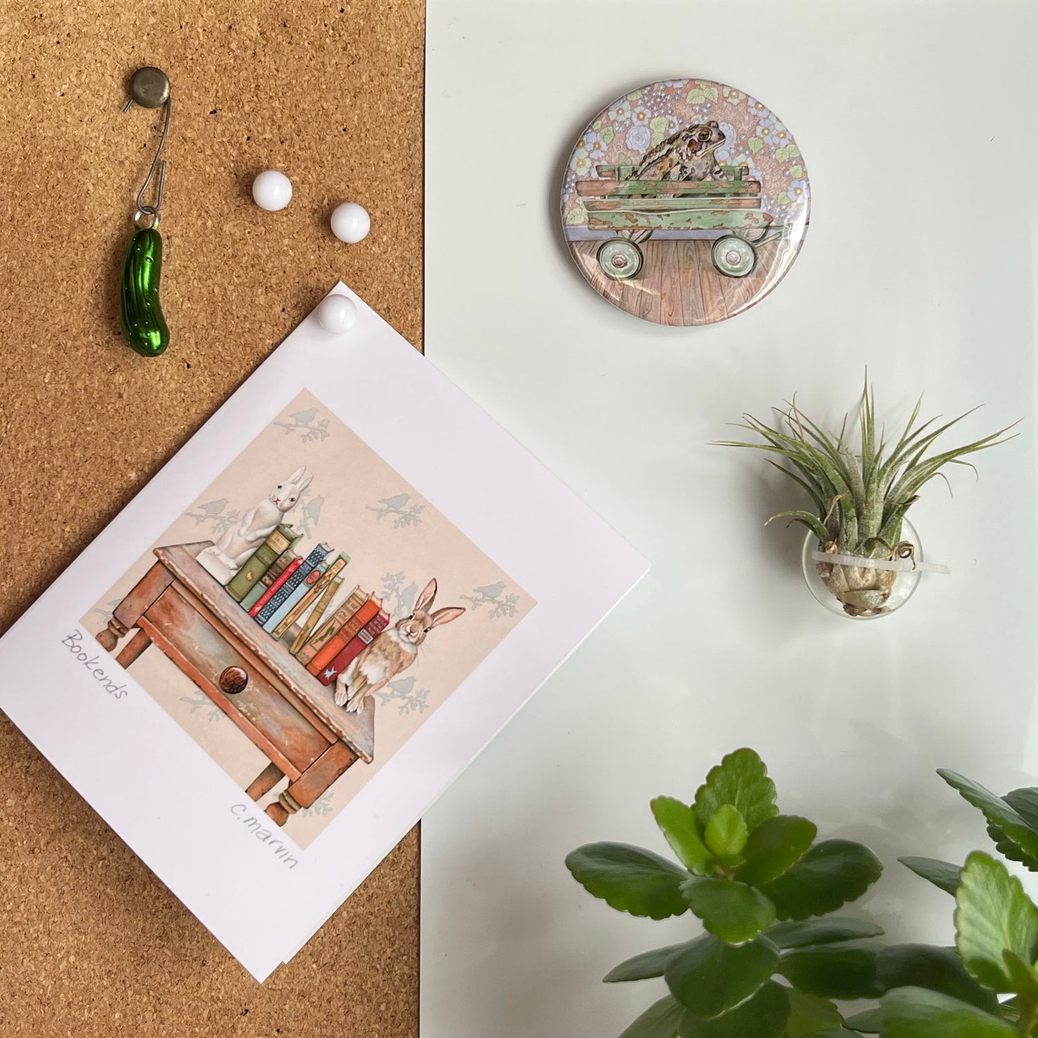 Each magnet measures 2.25” round and is totally protected from the messy kitchen environment with a laminated surface.  Beautifully packaged with a removable backing, these are great tucked in an art card or just gifted on their own. The magnet is very strong and capable of holding many papers and photos on your fridge, whiteboard, filing cabinet or locker.