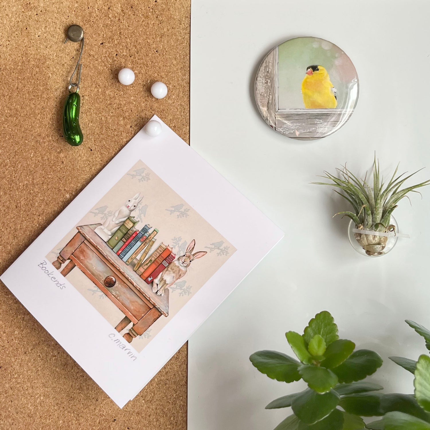 Each magnet measures 2.25” round and is totally protected from the messy kitchen environment with a laminated surface. Beautifully packaged with a removable backing, these are great tucked in an art card or just gifted on their own. The magnet is very strong and capable of holding many papers and photos on your fridge, whiteboard, filing cabinet or locker.