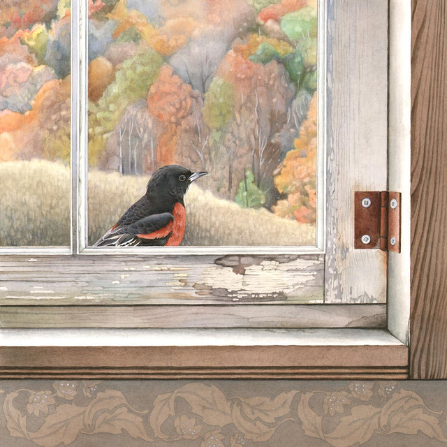 Each original watercolour painting begins with a detailed pencil drawing. The drawing process involves real-life objects from our farm, the use of my own photo references of our resident wildlife, and many pattern and colour studies. The wallpaper patterns seen in many of my pieces are created from scratch… from doodle to design! As for the watercolour itself, all of the pieces are painted on a hot-pressed block using fine brushes, watercolour paint and pencils and, as yet, no magnifying glass.