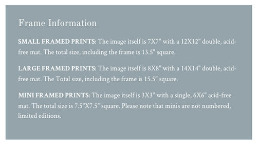 Minis: The image itself is 3X3" with a 6X6" SINGLE acid-free mat. The total size, including the frame is 7.5X7.5". Please note that minis are not numbered editions.