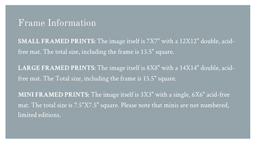 Small framed prints: The image itself is 7X7" with a 12X12" double, acid-free mat. The total size, including the frame is 13.5" square.