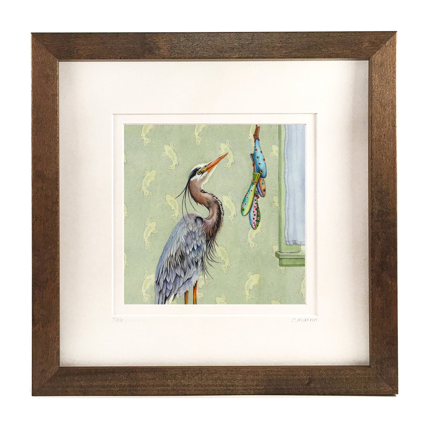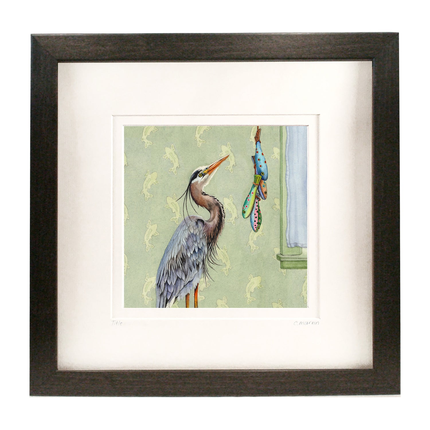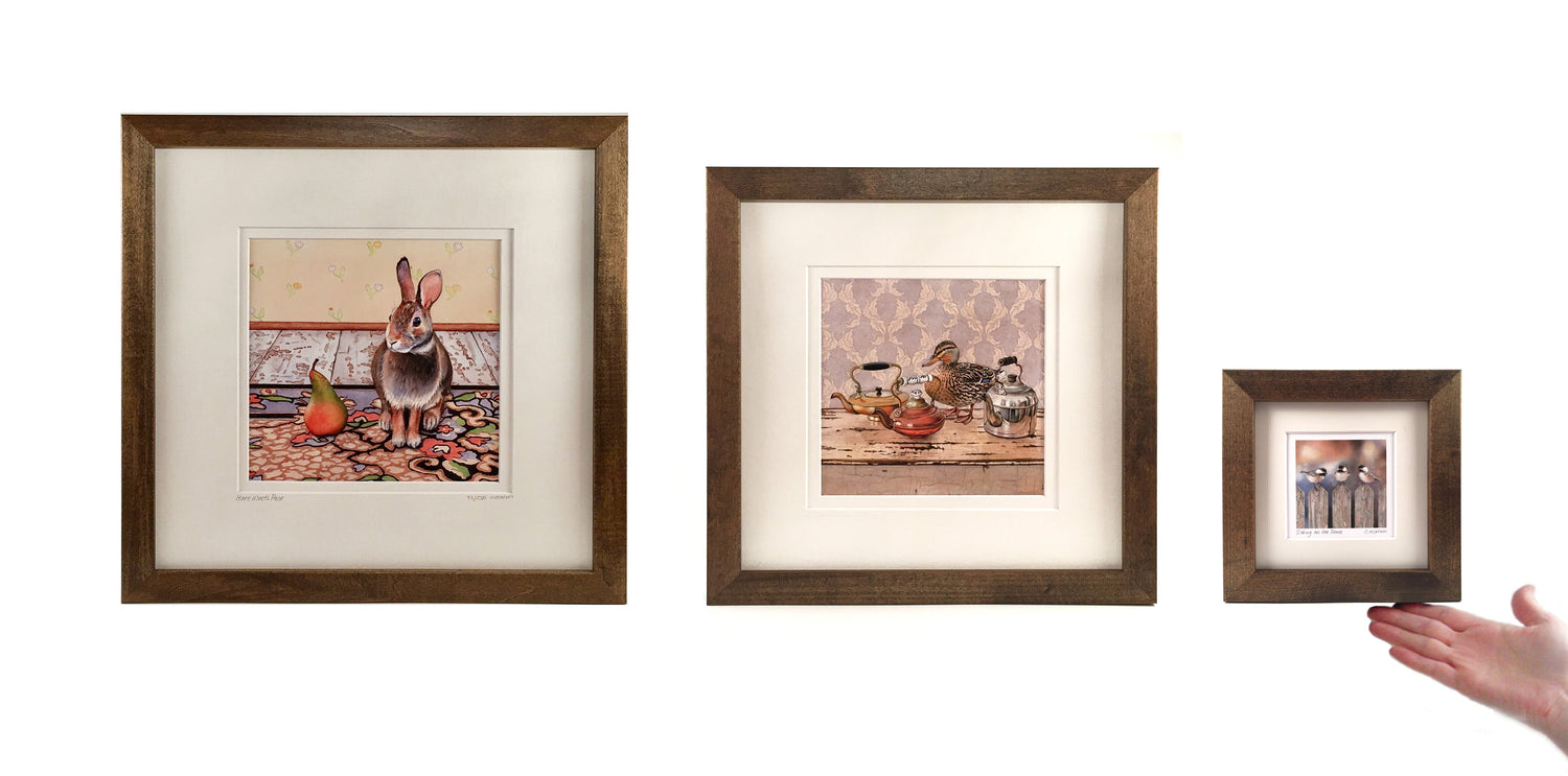 Each framed, limited edition is numbered (minis excepted) and signed by hand from a series of 250 and is beautifully crisp, vibrant and clear. Inks are archival quality, with superior durability and light resistance. The gallery-style frame is made of basswood and is stained in your choice of colour: walnut, ebony or driftwood. The natural grain of the basswood comes through beautifully with these stains. On a wall, they have a lovely, yet unassuming presence that complements the subtlety of the original watercolour.