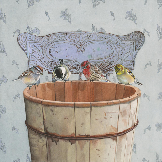 Our seed bucket gets some serious scrutiny here as the sparrow, chickadee, purple finch and goldfinch stare intently into its depths.