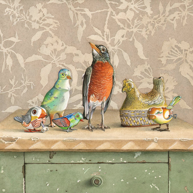 Sir Peeps is a very proud robin surrounded by wind-up toy imitators.