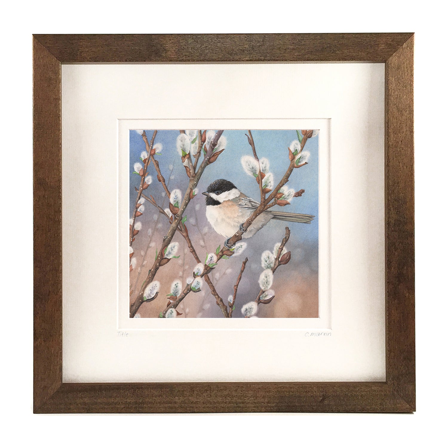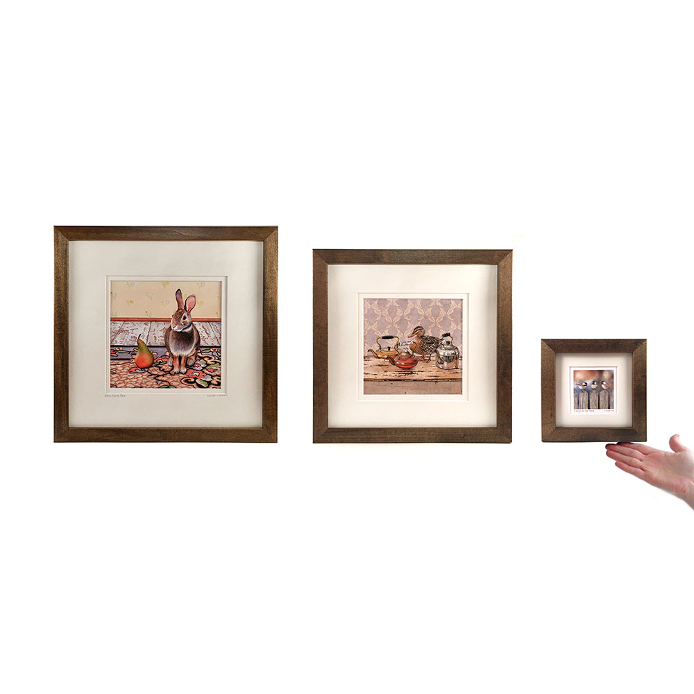 Each framed, limited edition is numbered (minis excepted) and signed by hand from a series of 250 and is beautifully crisp, vibrant and clear. Inks are archival quality, with superior durability and light resistance. The gallery-style frame is made of basswood and is stained in your choice of colour: walnut, ebony or driftwood. The natural grain of the basswood comes through beautifully with these stains. On a wall, they have a lovely, yet unassuming presence that complements the subtlety of the original watercolour.