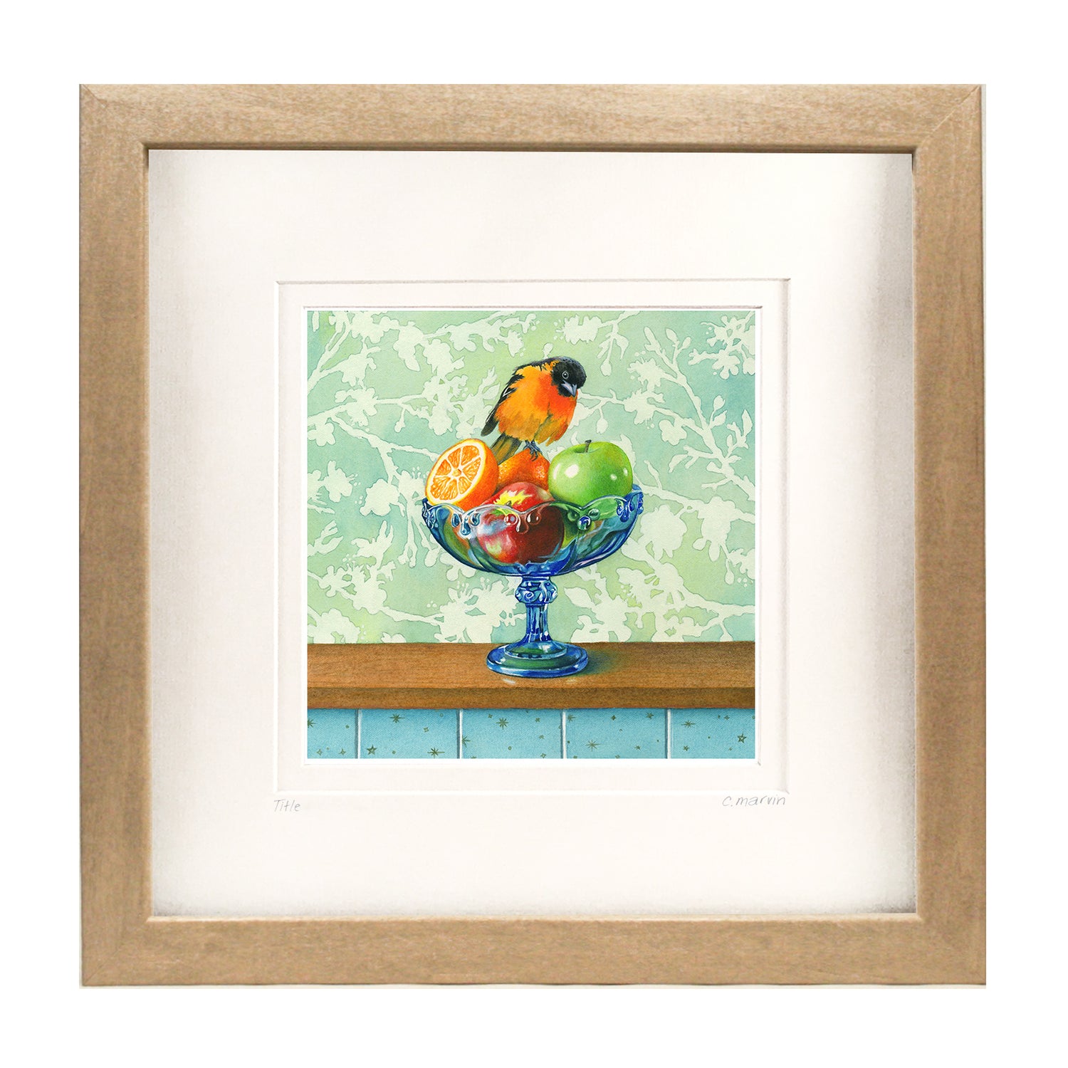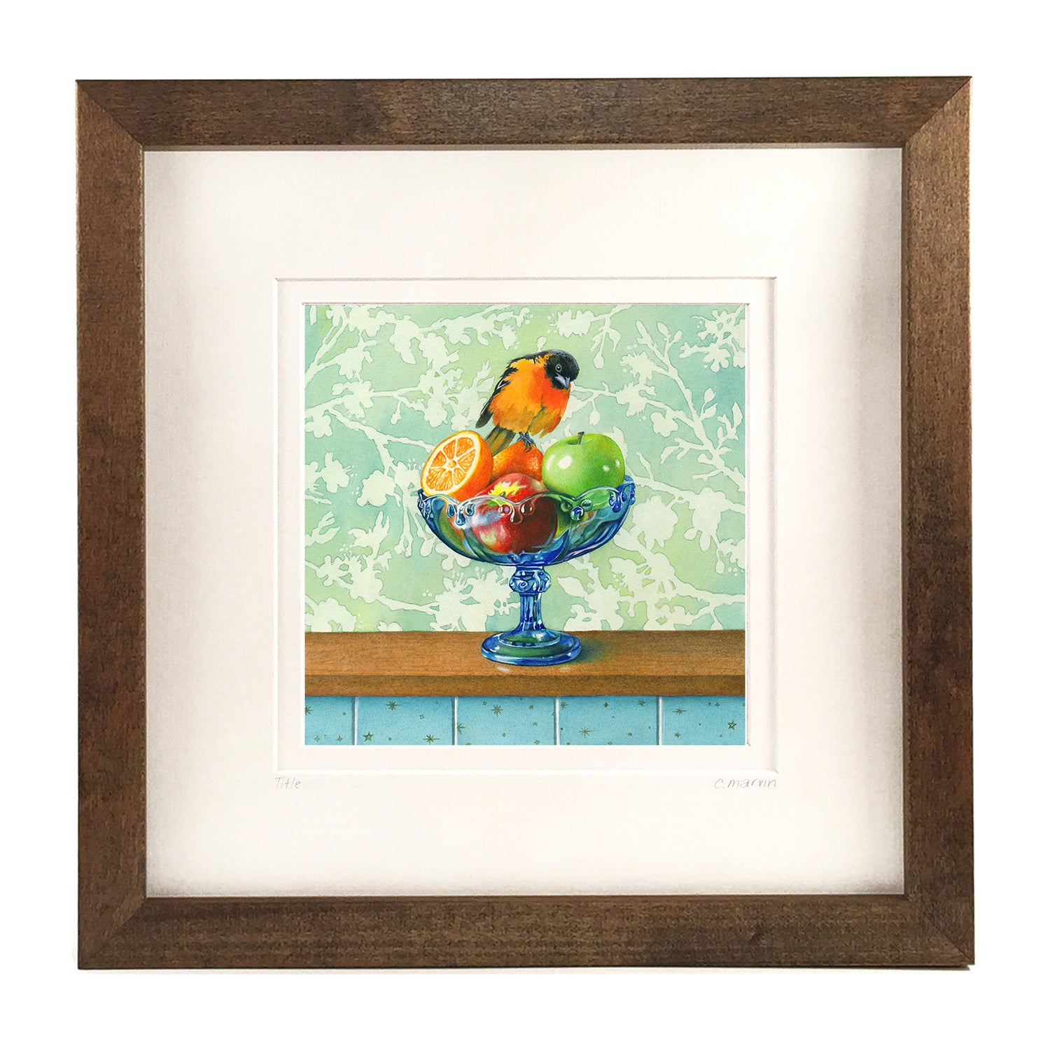 Each framed, limited edition is numbered (minis excepted) and signed by hand from a series of 250 and is beautifully crisp, vibrant and clear. Inks are archival quality, with superior durability and light resistance. The gallery-style frame is made of basswood and is stained in your choice of colour: walnut, ebony or driftwood. The natural grain of the basswood comes through beautifully with these stains. On a wall, they have a lovely, yet unassuming presence that complements the subtlety of the original watercolour.