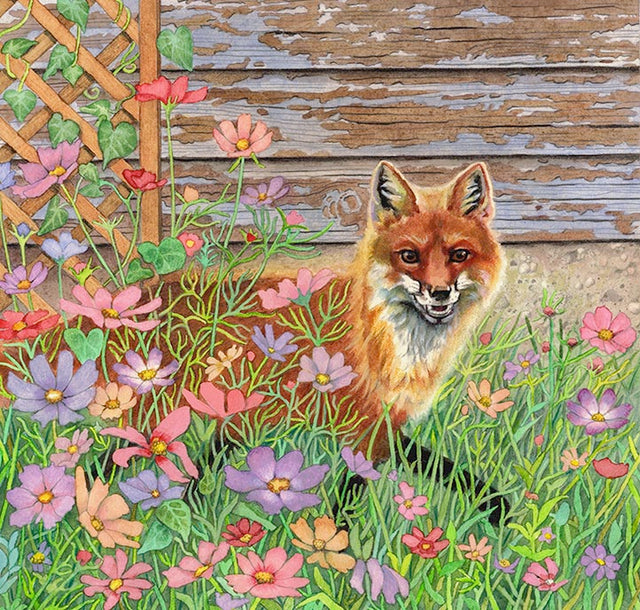A fox tiptoes out of the cosmos flowers after some serious
