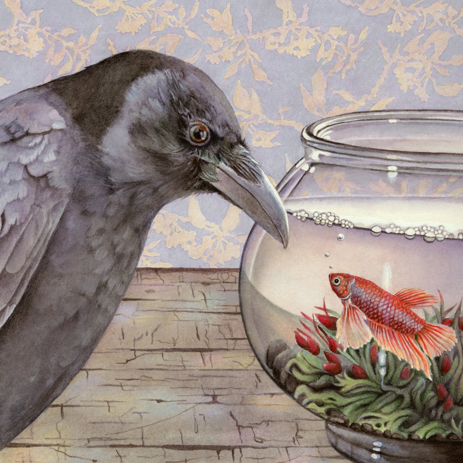 Each original watercolour painting begins with a detailed pencil drawing. The drawing process involves real-life objects from our farm, the use of my own photo references of our resident wildlife, and many pattern and colour studies. The wallpaper patterns seen in many of my pieces are created from scratch… from doodle to design! As for the watercolour itself, all of the pieces are painted on a hot-pressed block using fine brushes, watercolour paint and pencils and, as yet, no magnifying glass.