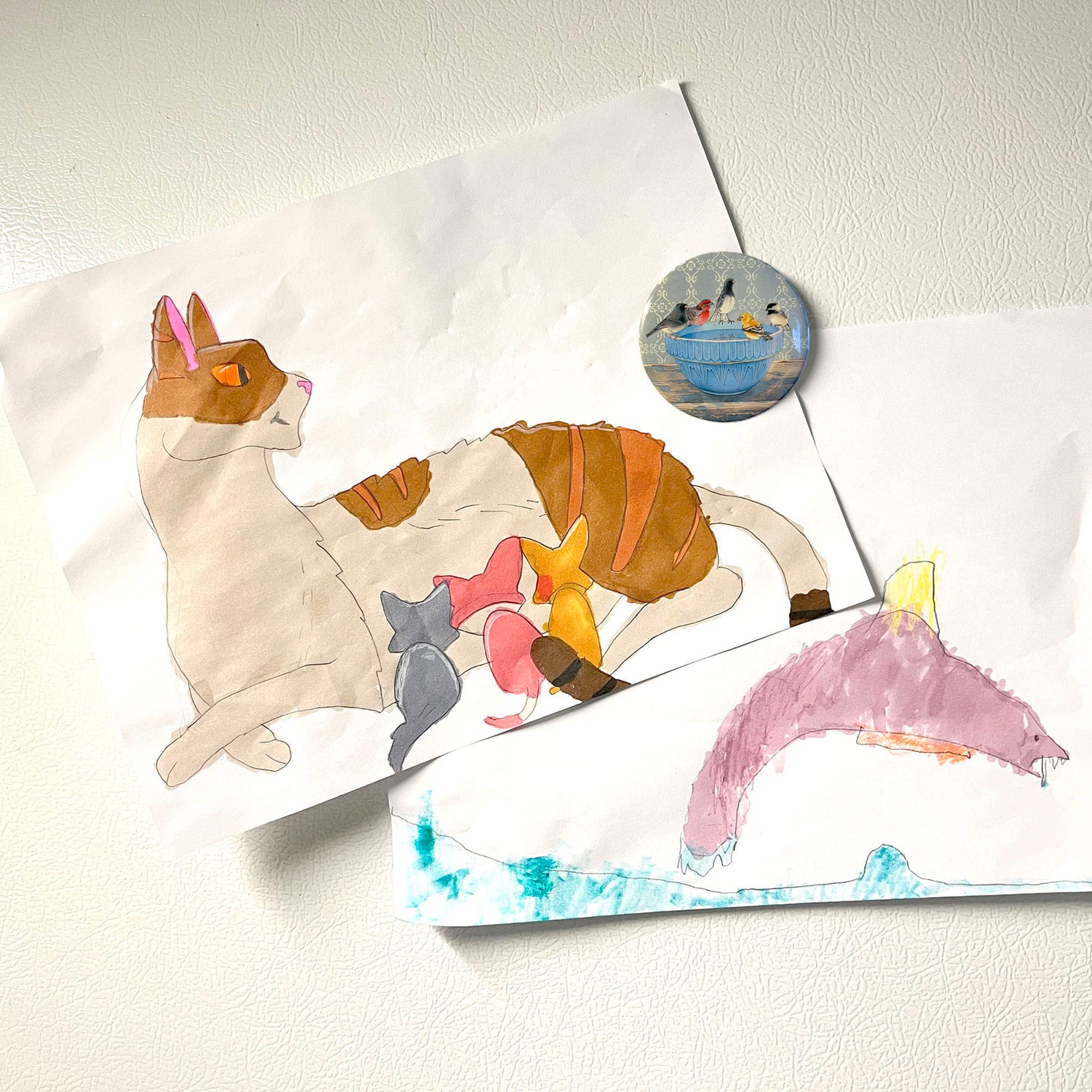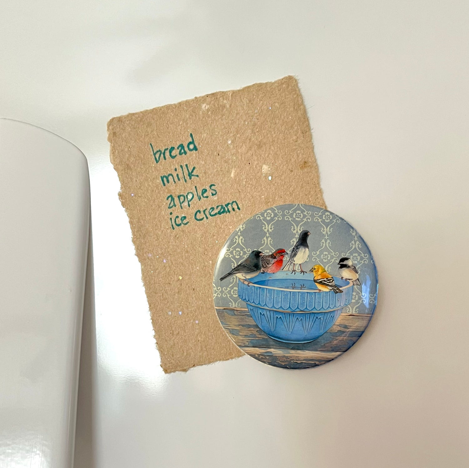 Each magnet measures 2.25” round and is totally protected from the messy kitchen environment with a laminated surface. Beautifully packaged with a removable backing, these are great tucked in an art card or just gifted on their own. The magnet is very strong and capable of holding many papers and photos on your fridge, whiteboard, filing cabinet or locker.