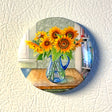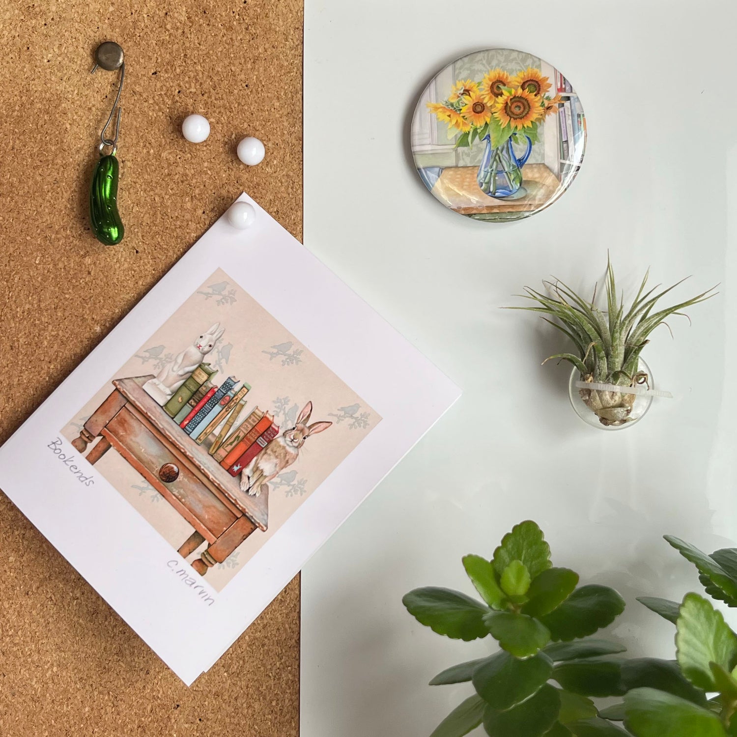 Each magnet measures 2.25” round and is totally protected from the messy kitchen environment with a laminated surface. Beautifully packaged with a removable backing, these are great tucked in an art card or just gifted on their own. The magnet is very strong and capable of holding many papers and photos on your fridge, whiteboard, filing cabinet or locker.