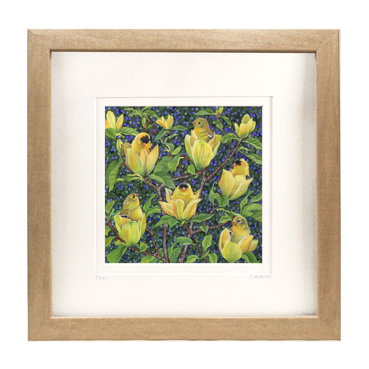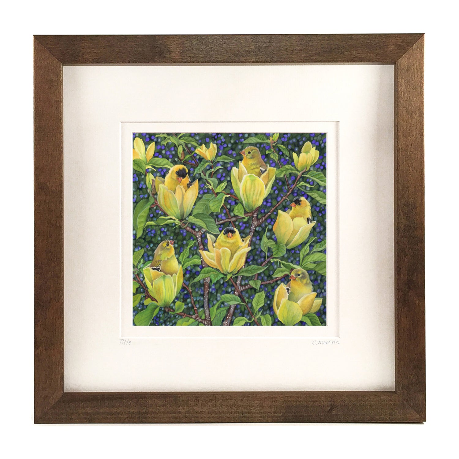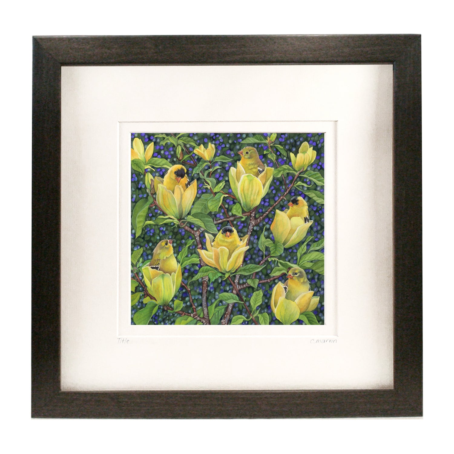 Each framed, limited edition is numbered (minis excepted) and signed by hand from a series of 250 and is beautifully crisp, vibrant and clear. Inks are archival quality, with superior durability and light resistance. The gallery-style frame is made of basswood and is stained in your choice of colour: walnut, ebony or driftwood. The natural grain of the basswood comes through beautifully with these stains. On a wall, they have a lovely, yet unassuming presence that complements the subtlety of the original watercolour.