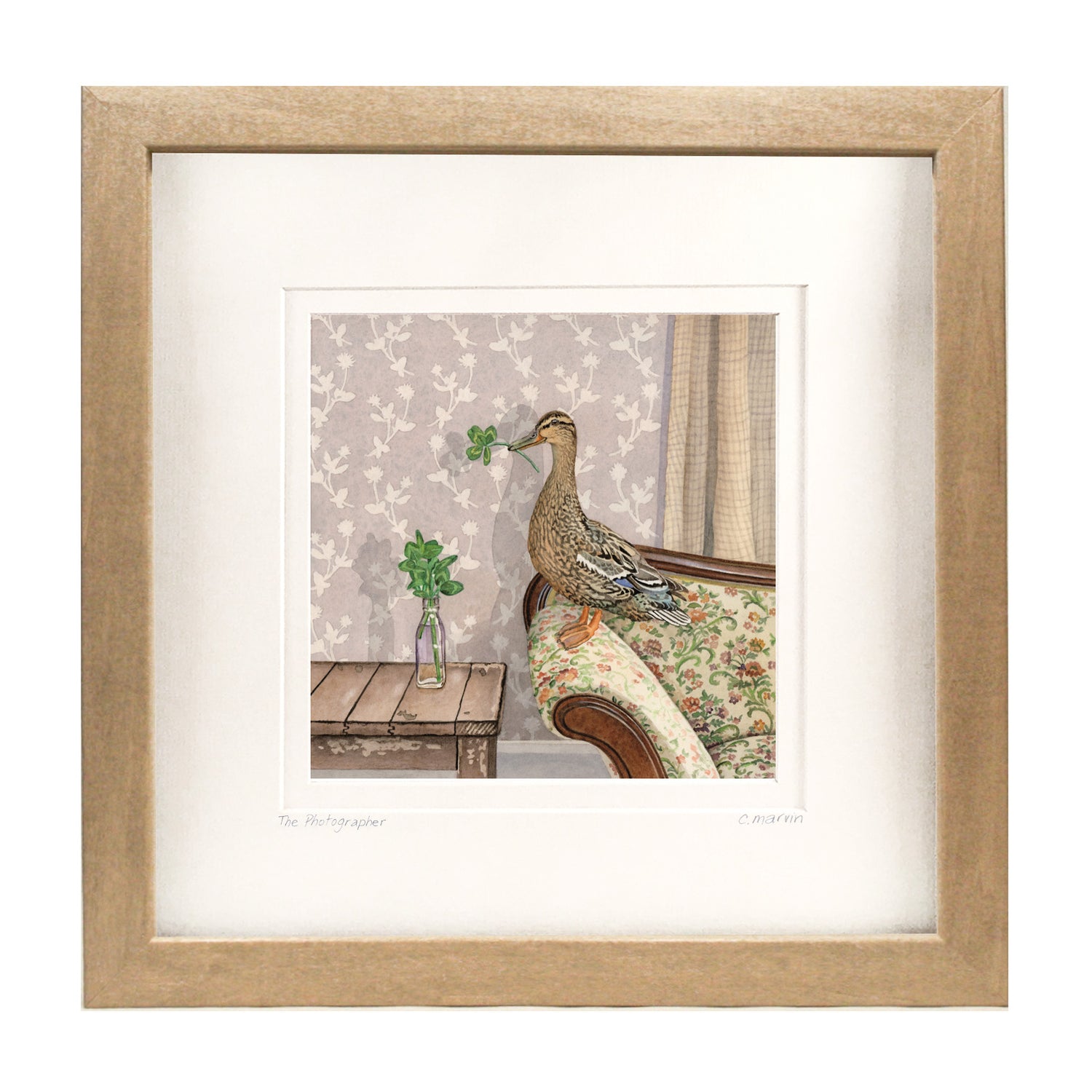 Each framed, limited edition is numbered (minis excepted) and signed by hand from a series of 250 and is beautifully crisp, vibrant and clear. Inks are archival quality, with superior durability and light resistance. The gallery-style frame is made of basswood and is stained in your choice of colour: walnut, ebony or driftwood. The natural grain of the basswood comes through beautifully with these stains. On a wall, they have a lovely, yet unassuming presence that complements the subtlety of the original watercolour.