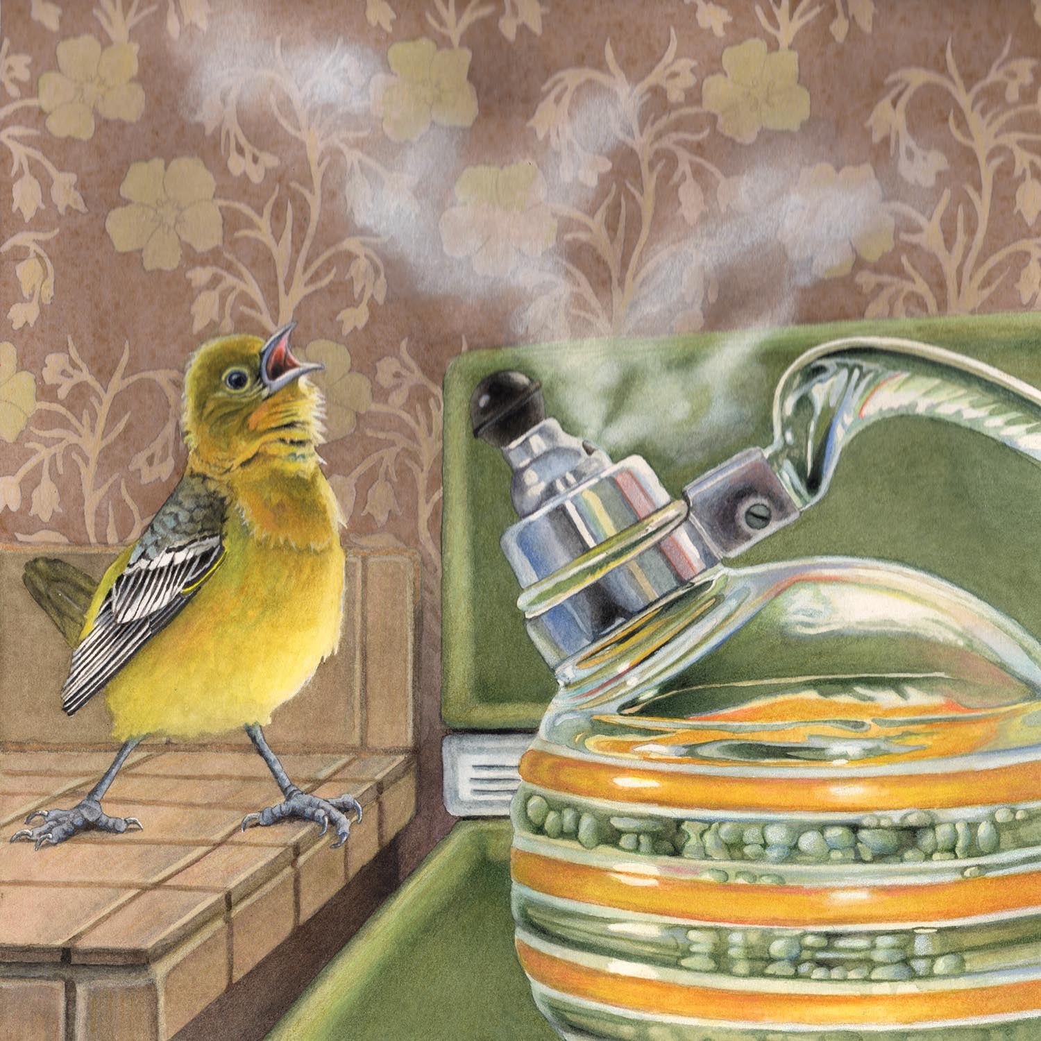 The question may be, who is teaching who to sing? This female oriole is giving the boiling kettle a run for its money.