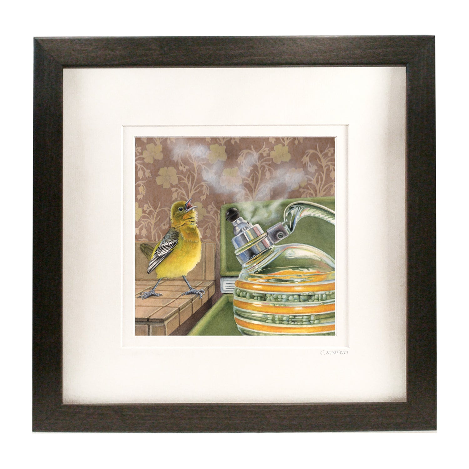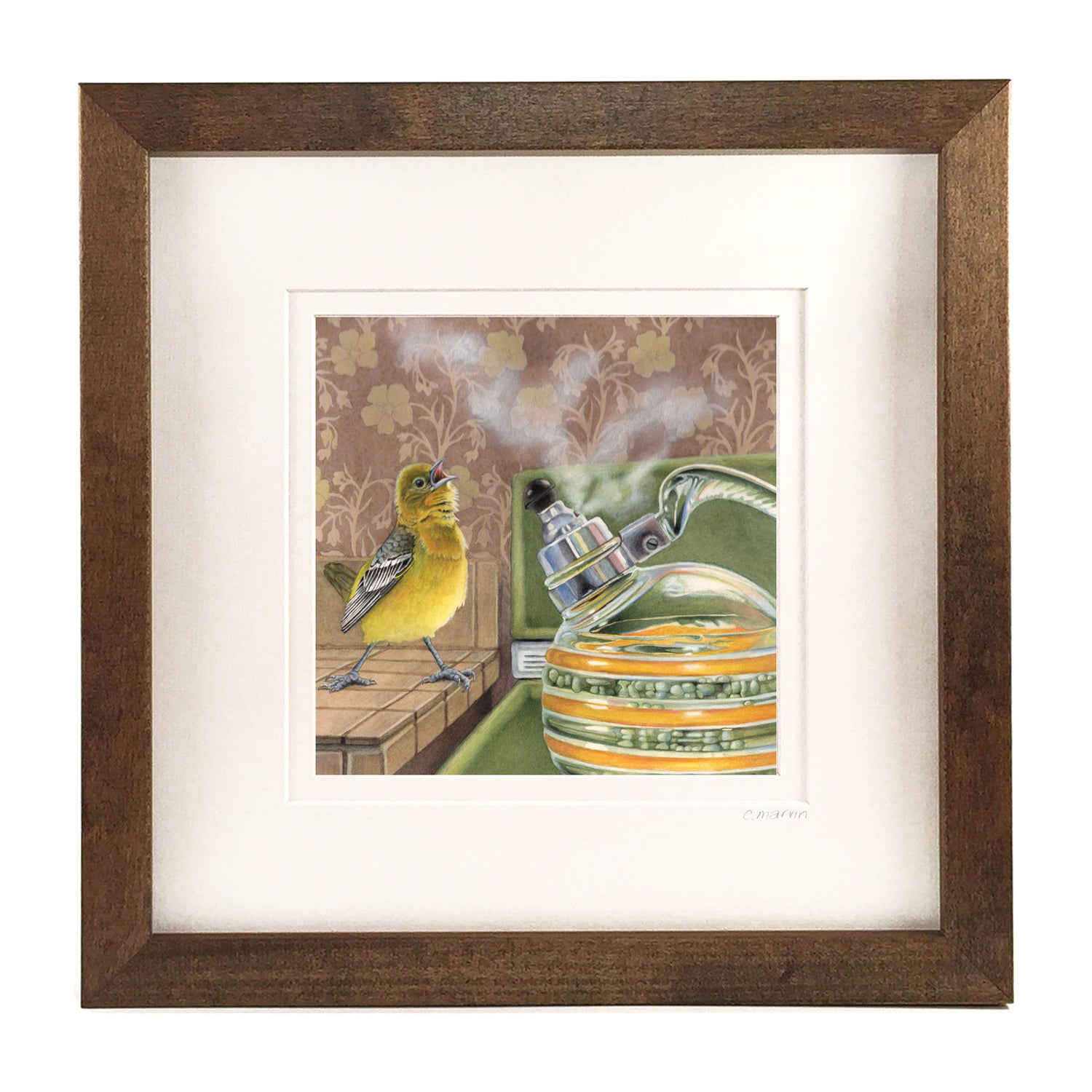 Each framed, limited edition is numbered (minis excepted) and signed by hand from a series of 250 and is beautifully crisp, vibrant and clear. Inks are archival quality, with superior durability and light resistance. The gallery-style frame is made of basswood and is stained in your choice of colour: walnut, ebony or driftwood. The natural grain of the basswood comes through beautifully with these stains. On a wall, they have a lovely, yet unassuming presence that complements the subtlety of the original watercolour.