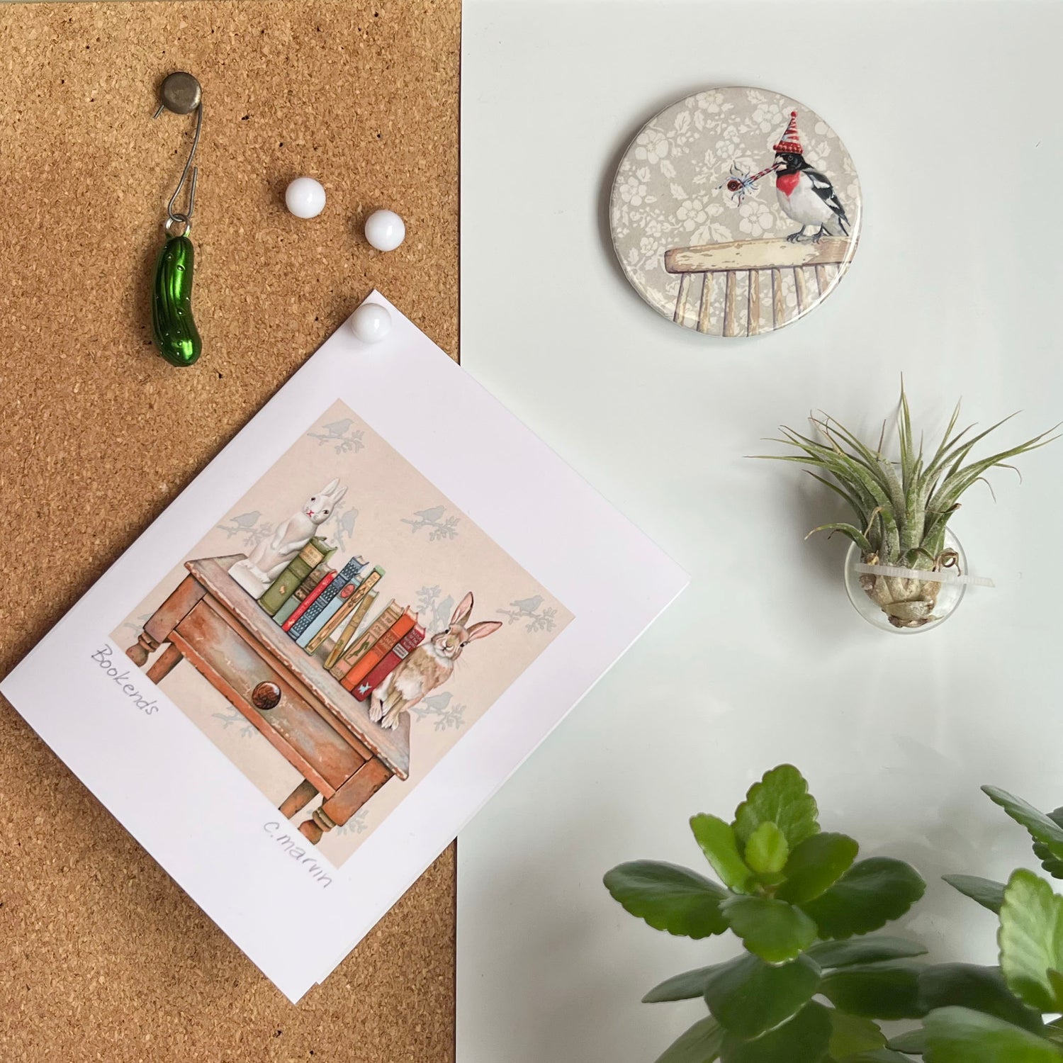 Each magnet measures 2.25” round and is totally protected from the messy kitchen environment with a laminated surface. Beautifully packaged with a removable backing, these are great tucked in an art card or just gifted on their own. The magnet is very strong and capable of holding many papers and photos on your fridge, whiteboard, filing cabinet or locker.