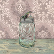 A female hummingbird rests perched atop an old ball jar. I've always imagined the challenge of painting wallpaper through the distorted lens of curved glass and it came together nicely in this piece.