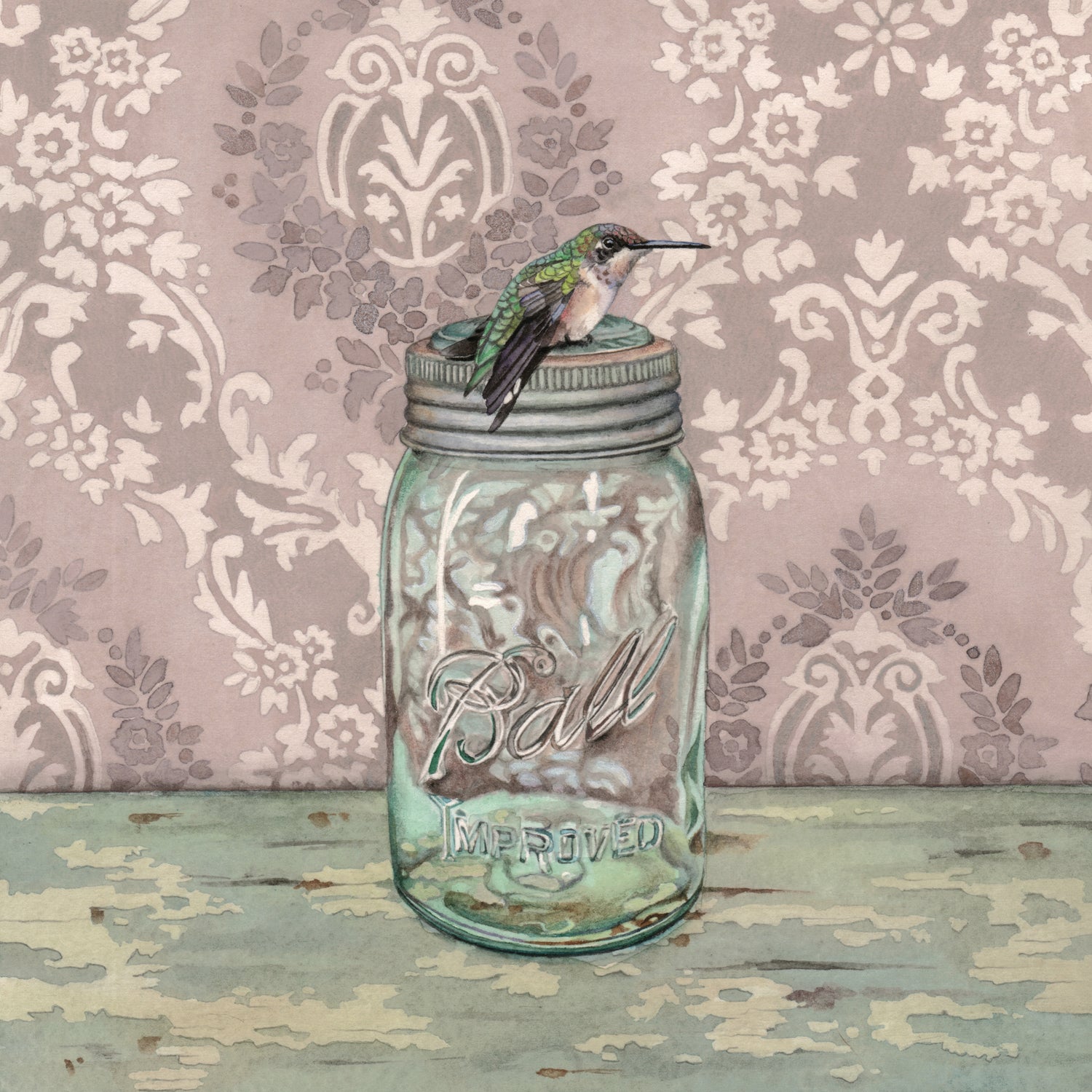 A female hummingbird rests perched atop an old ball jar. I've always imagined the challenge of painting wallpaper through the distorted lens of curved glass and it came together nicely in this piece.