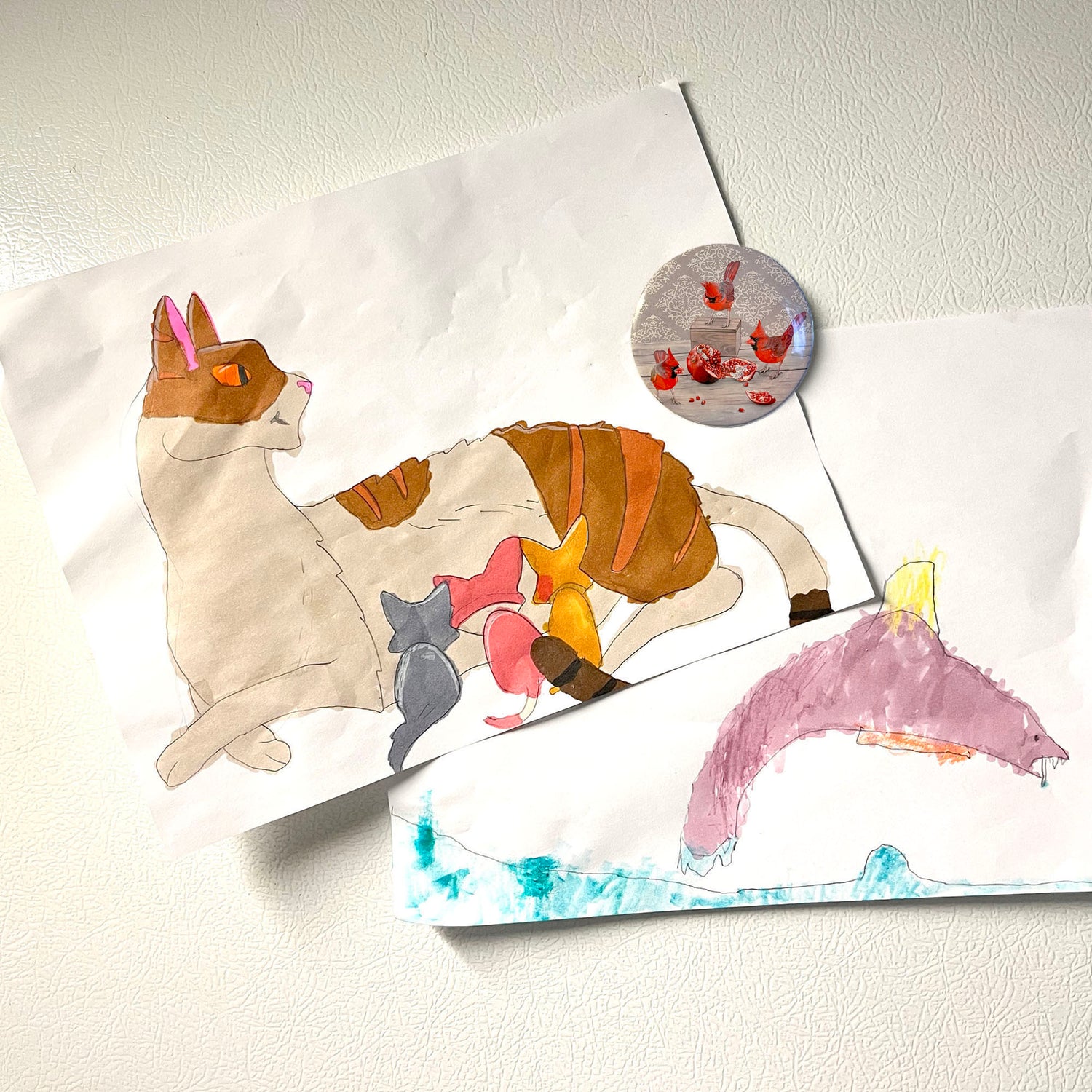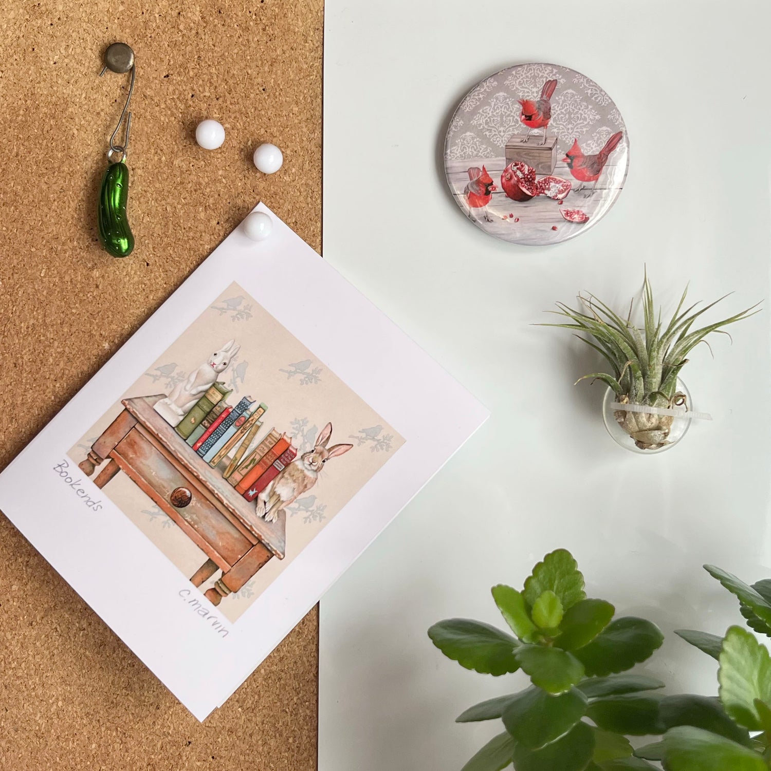 Each magnet measures 2.25” round and is totally protected from the messy kitchen environment with a laminated surface. Beautifully packaged with a removable backing, these are great tucked in an art card or just gifted on their own. The magnet is very strong and capable of holding many papers and photos on your fridge, whiteboard, filing cabinet or locker.