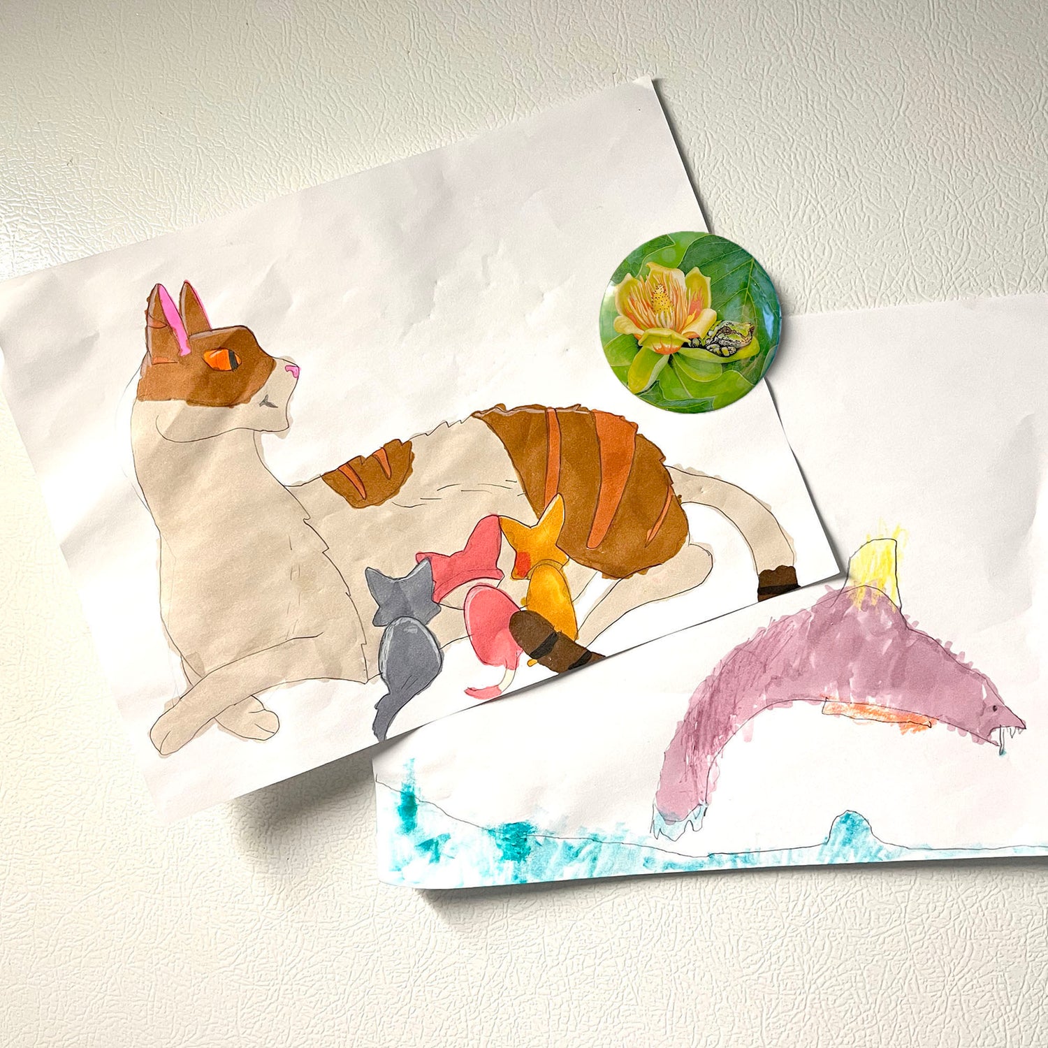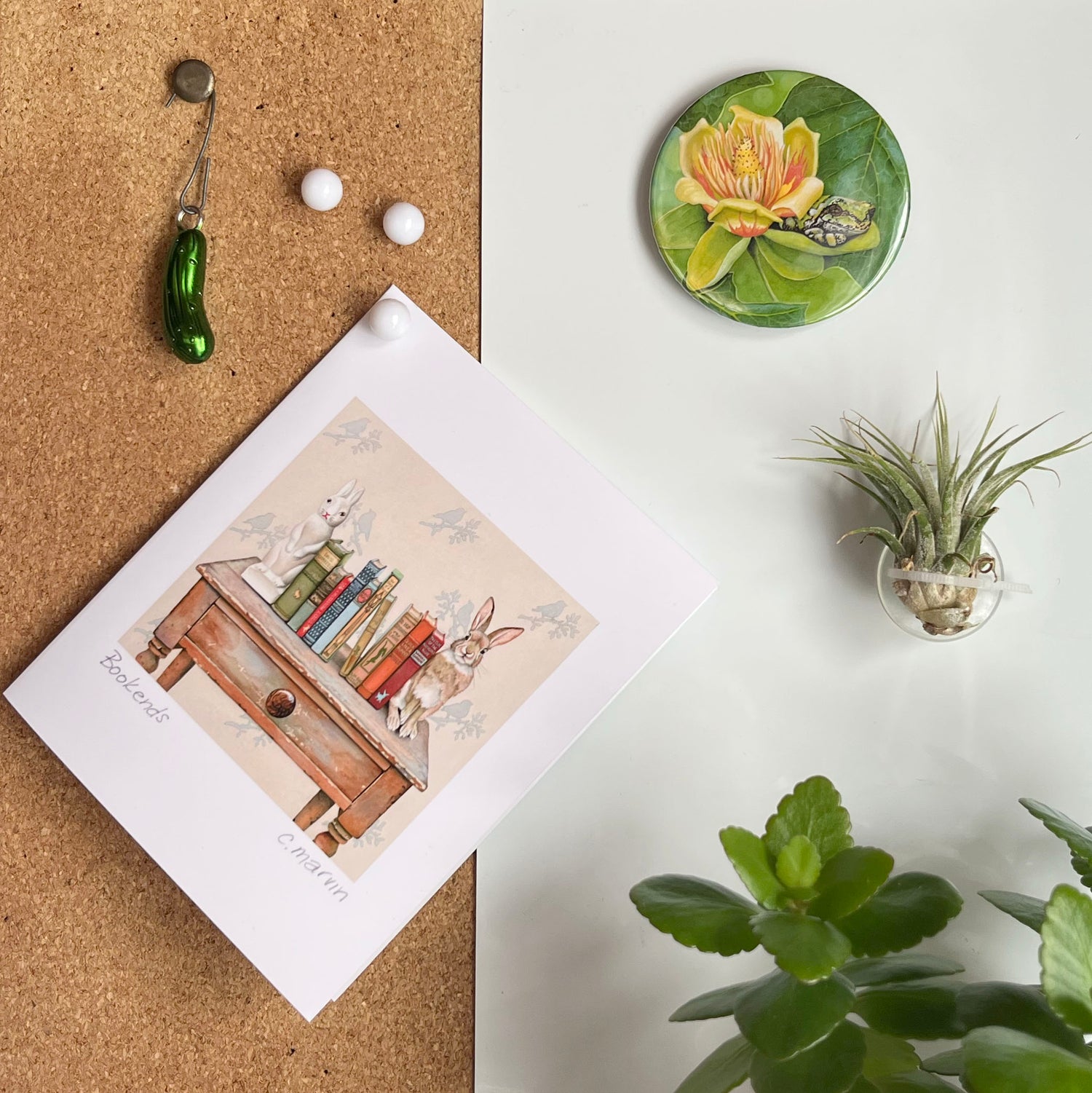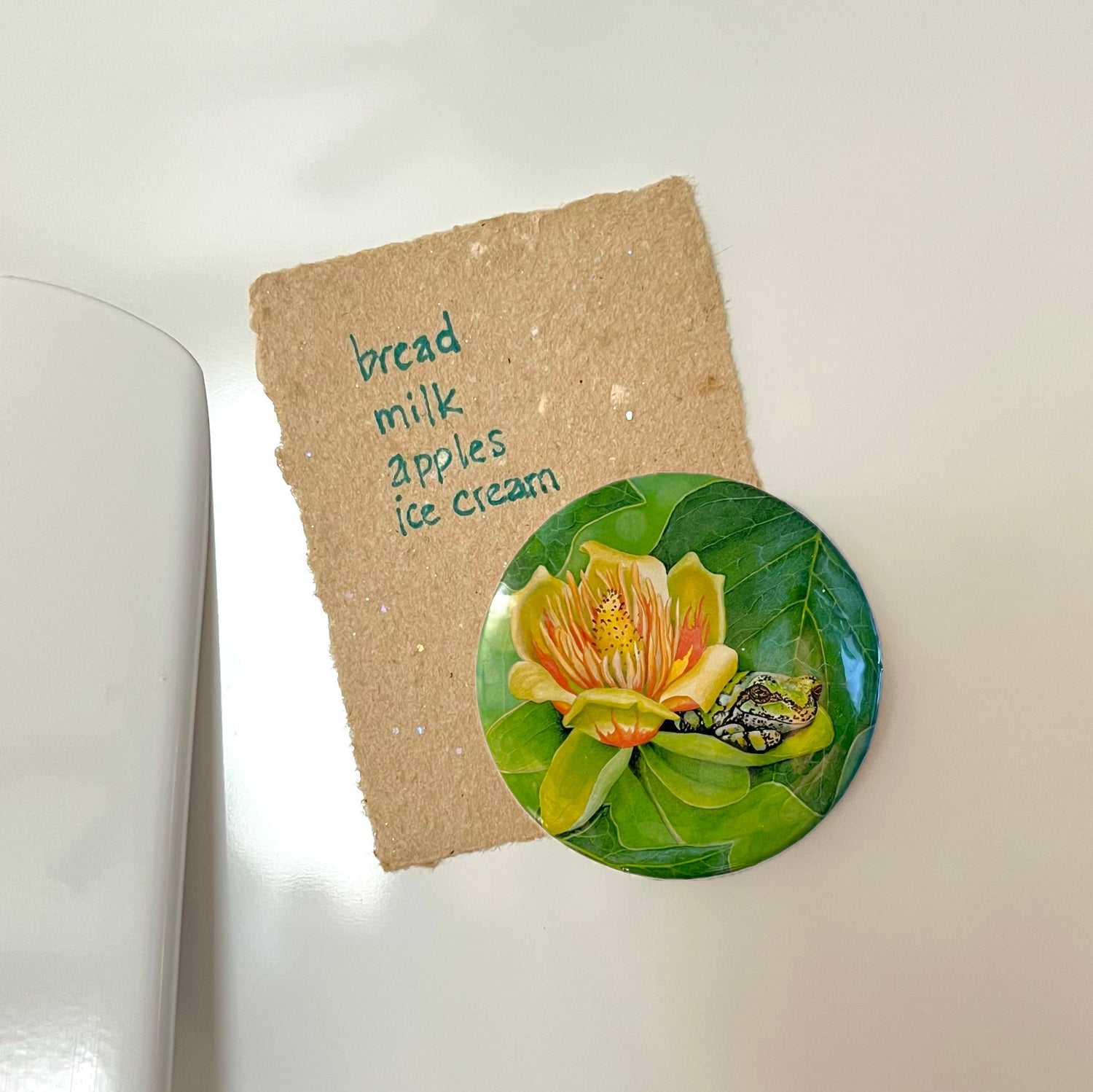 Each magnet measures 2.25” round and is totally protected from the messy kitchen environment with a laminated surface. Beautifully packaged with a removable backing, these are great tucked in an art card or just gifted on their own. The magnet is very strong and capable of holding many papers and photos on your fridge, whiteboard, filing cabinet or locker.