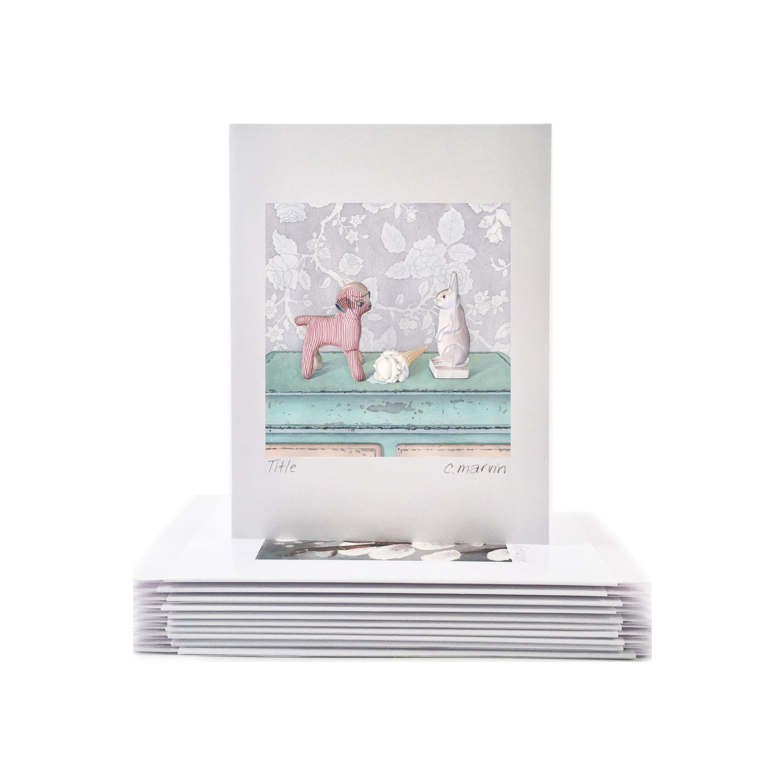 Each art card measures 4X5", comes with a matching white envelope (5.75X4.5") and is titled and signed within a clear plastic sleeve. The print is beautifully crisp and fade-resistant.