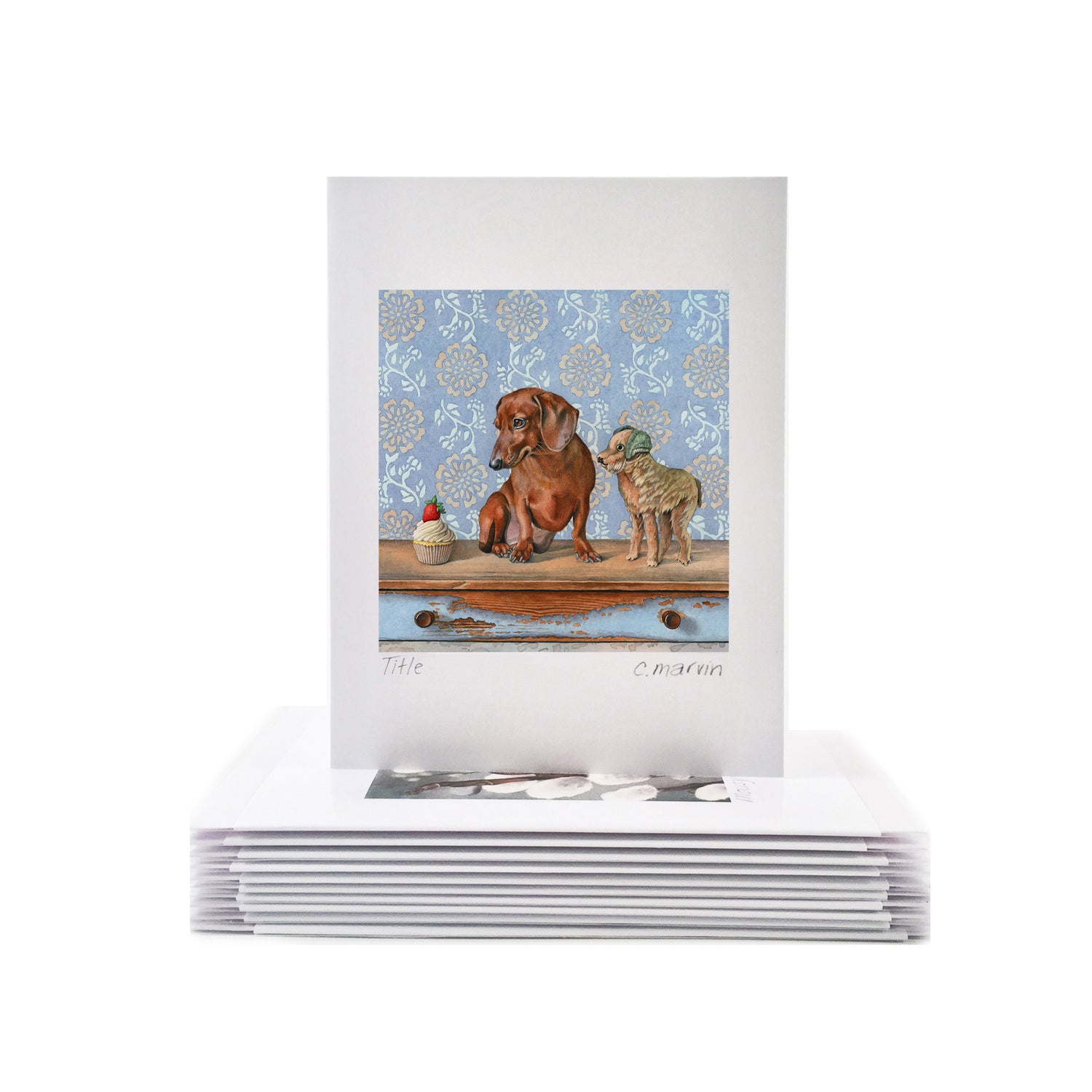 Each art card measures 4X5", comes with a matching white envelope (5.75X4.5") and is titled and signed within a clear plastic sleeve. The print is beautifully crisp and fade-resistant.