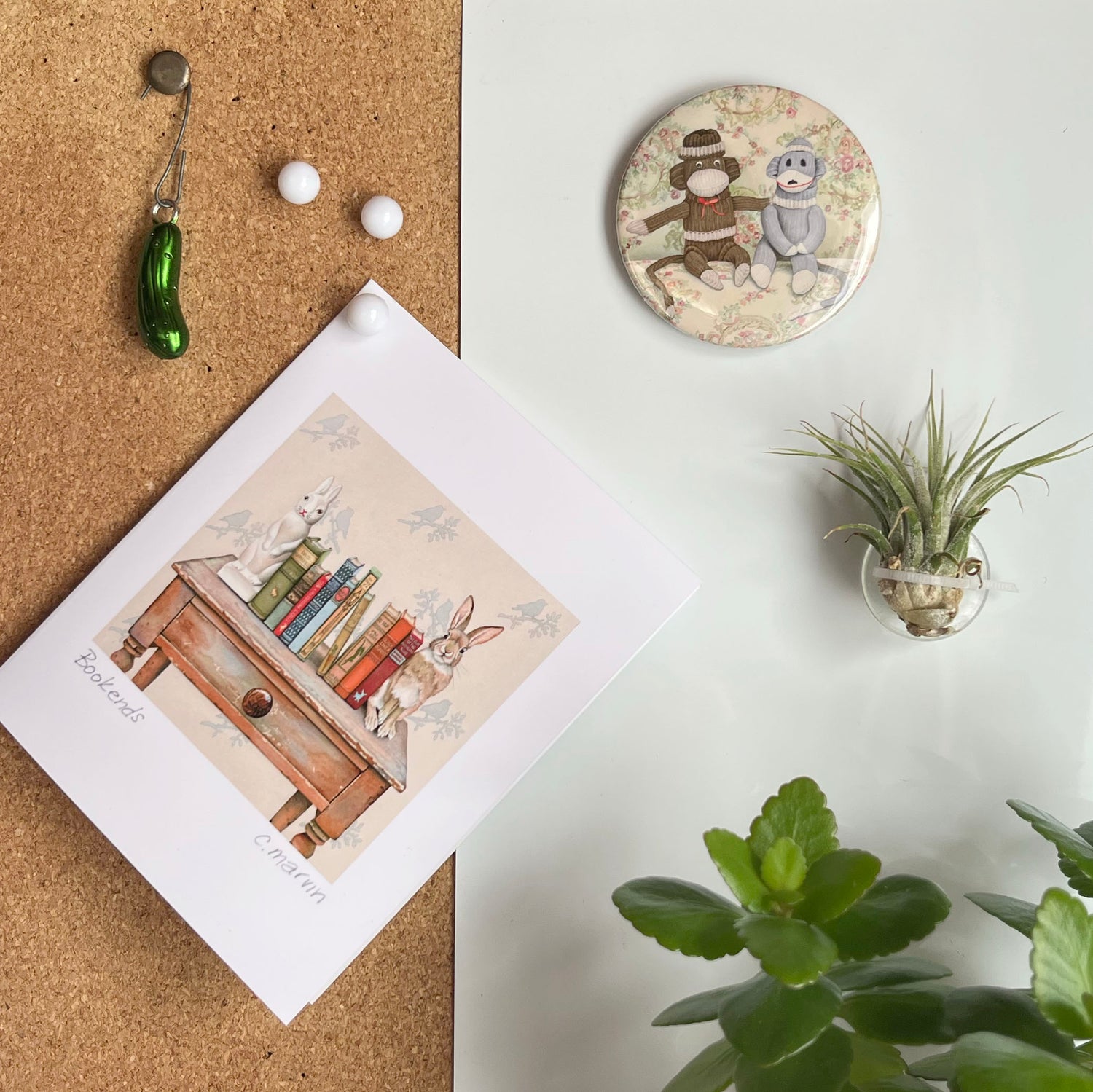 Each magnet measures 2.25” round and is totally protected from the messy kitchen environment with a laminated surface. Beautifully packaged with a removable backing, these are great tucked in an art card or just gifted on their own. The magnet is very strong and capable of holding many papers and photos on your fridge, whiteboard, filing cabinet or locker.