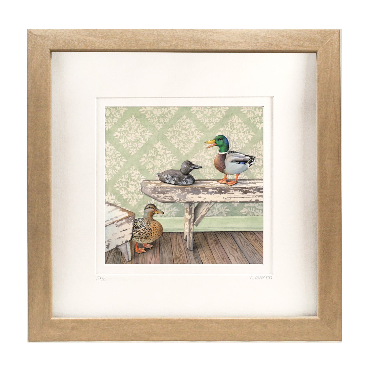 The male duck in this painting orates, oblivious that his audience is made of wood. The female, meanwhile, sneaks stealthily away.